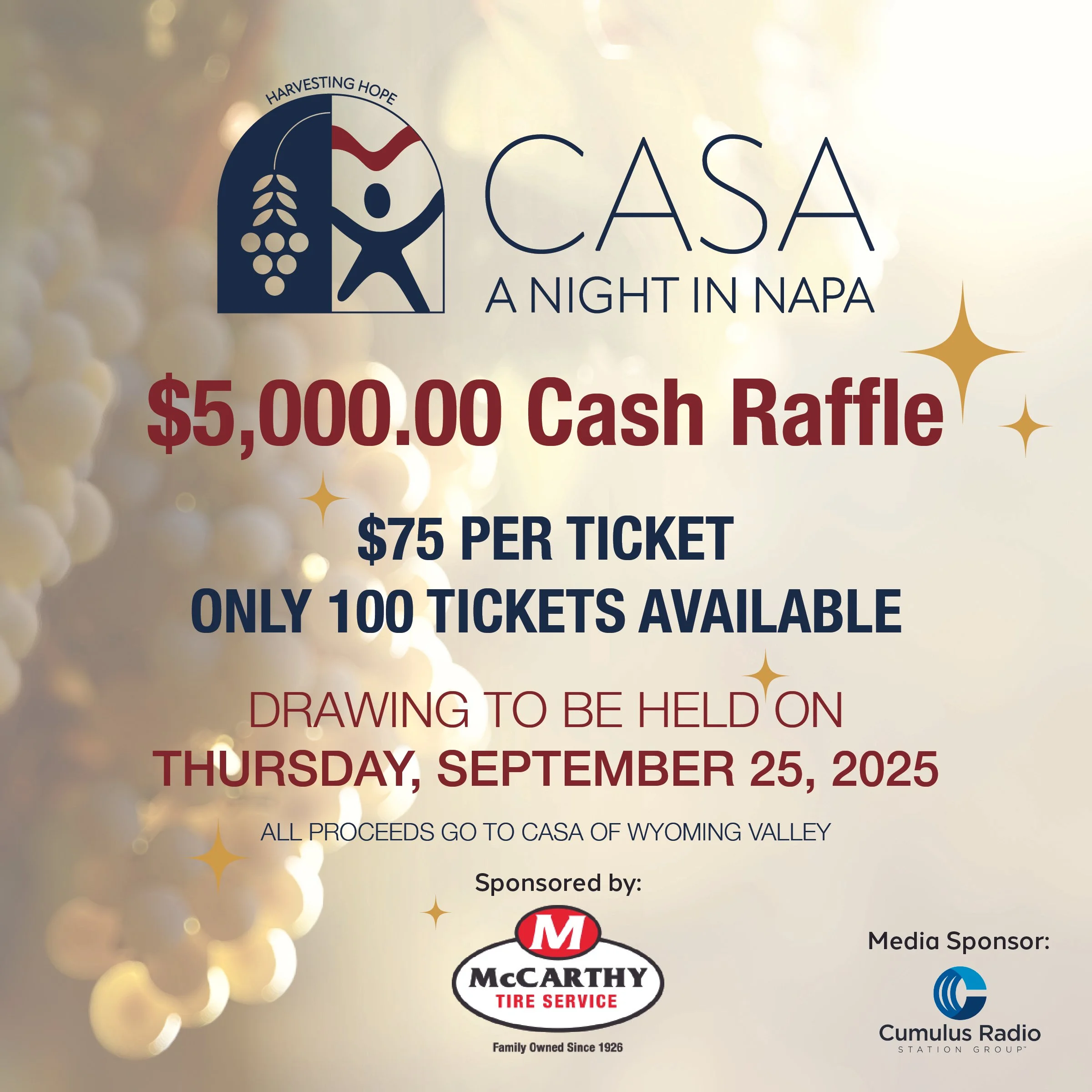 CASA of Wyoming Valley will be raffling off $5,000 at CASA: A Night in NAPA on Thursday, September 25, 2025 at The Beaumont Inn. You will have a 1 in 100 chance to win this prize as each entry will be pulled and eliminated, until there is only one winning ticket left!