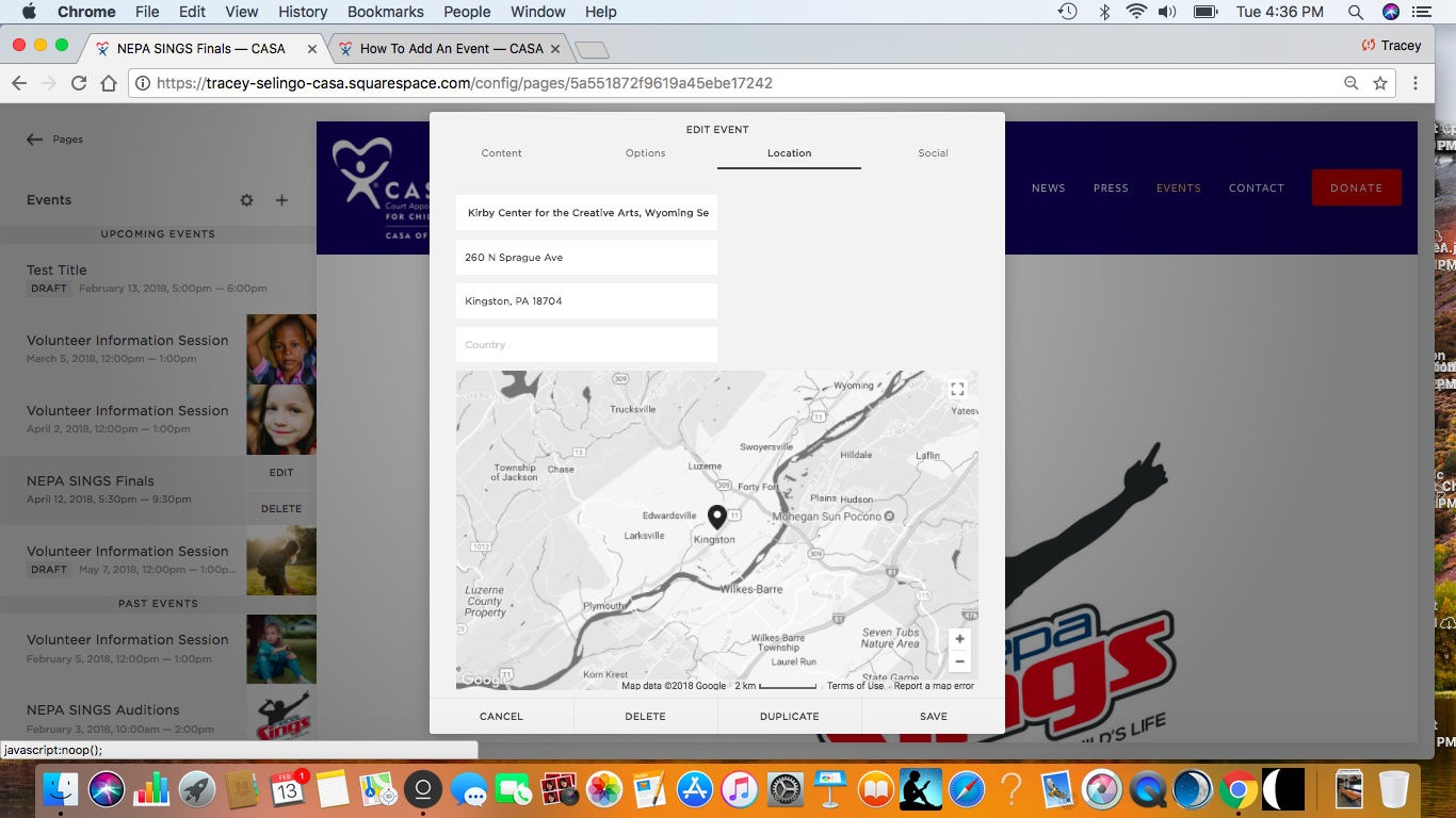 Click the LOCATION tab at the top of the page and enter the location of the event. This will automatically appear on the event page, it will automatically load on a calendar when a user select Google Calendar or ICS on the event page.